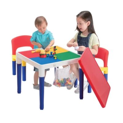 This 2-in-1 Building Block Table and Chairs Set features a play surface compatible with blocks from major brands in the market. It comes with a removable table cover and a mesh storage bag filled with a 100 piece block set. With the cover on the table, it is the perfect size for toddlers to read books, color, do arts and crafts, play board games, and just have fun. This piece of furniture is easy to assemble with snap-together components. Giving your little one a table and chair set at their size gives them a sense of control and helps them learn independence.