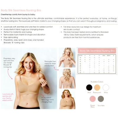 The Body Silk Seamless Breastfeeding Bra provides completely seamless comfort. It is perfect for everyday use, whether at home or at work. The very soft fabric conforms to your changing breast shape so you can wear it throughout pregnancy and breastfeeding.