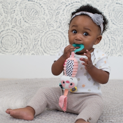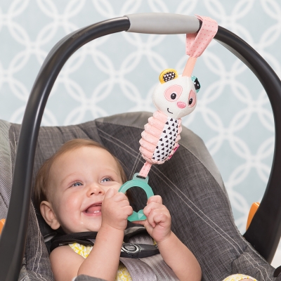 " 适合初生婴儿使用 不含BPA质感牙胶 会发出轻快声响 可挂于婴儿车及婴儿汽车座椅 "