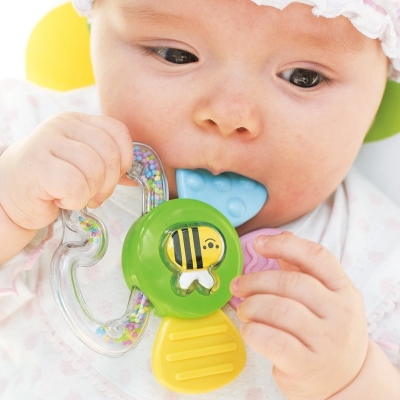 發聲玩具吸引孩子抓取 .咬牙膠讓孩子有安全感 .顏色柔和,外型可愛